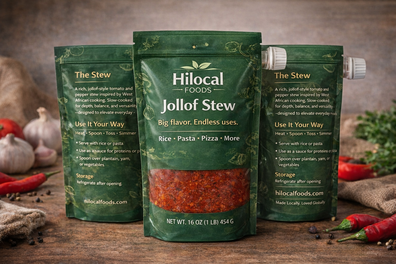Hilocal Foods Jollof Stew is a rich, slow-cooked tomato and pepper stew prepared using traditional West African techniques and carefully balanced spices. Deeply flavorful and aromatic, this stew is designed to be versatile—bold enough to stand alone, yet balanced enough to complement a wide range of dishes.